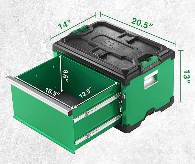 - Expand your tool storage system with steel boxes and cabinets that provide space-saving organization and mobility. These units can be combined with a dolly cart and easily stacked onto any existing SK stacking module, allowing you to customize your tool storage solution according to your specific needs.